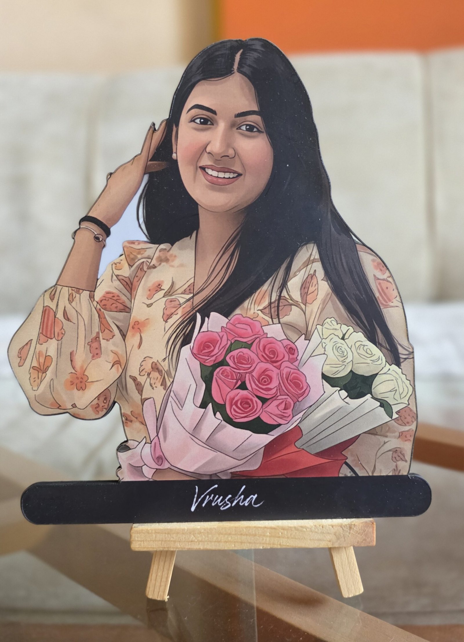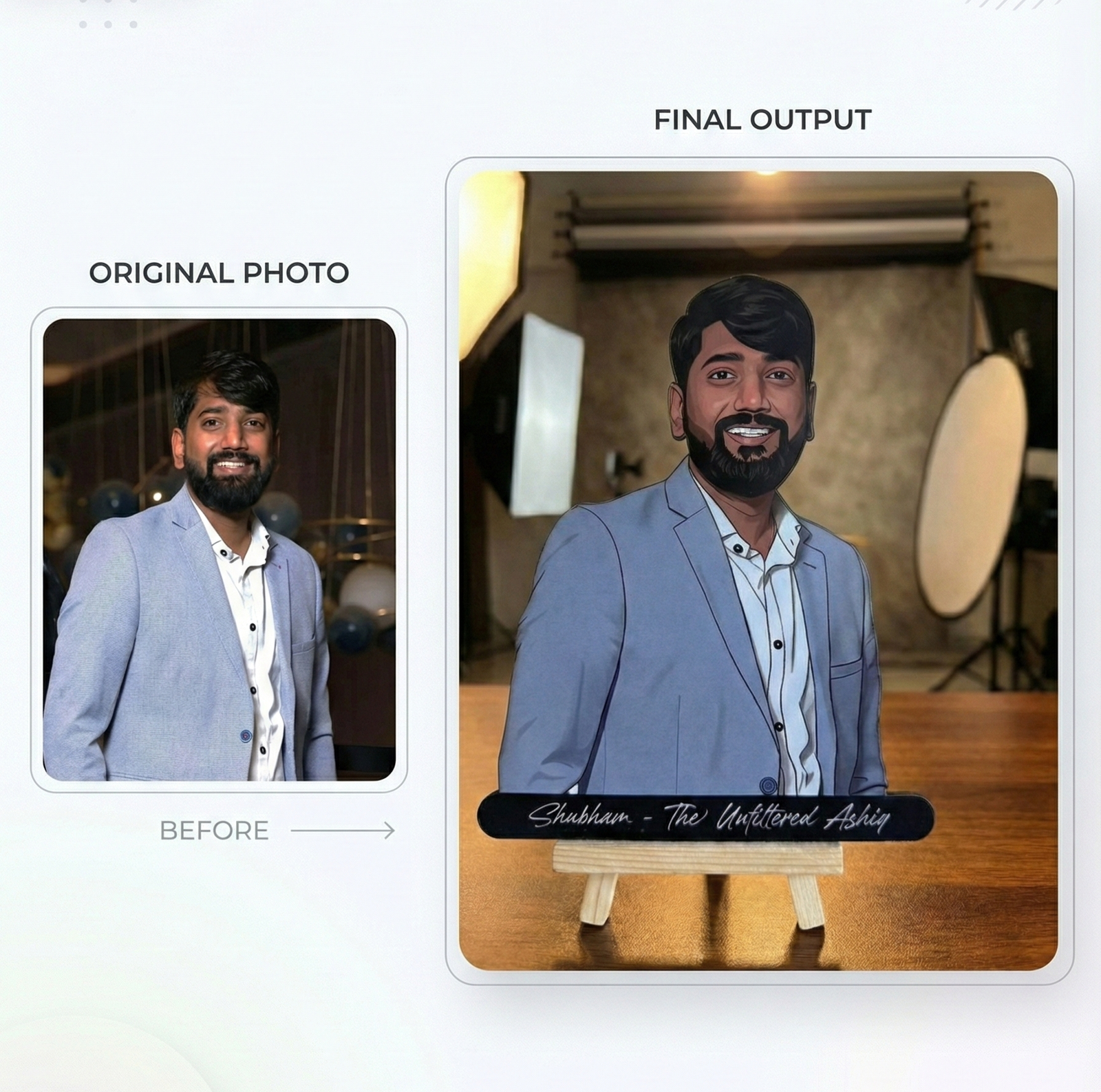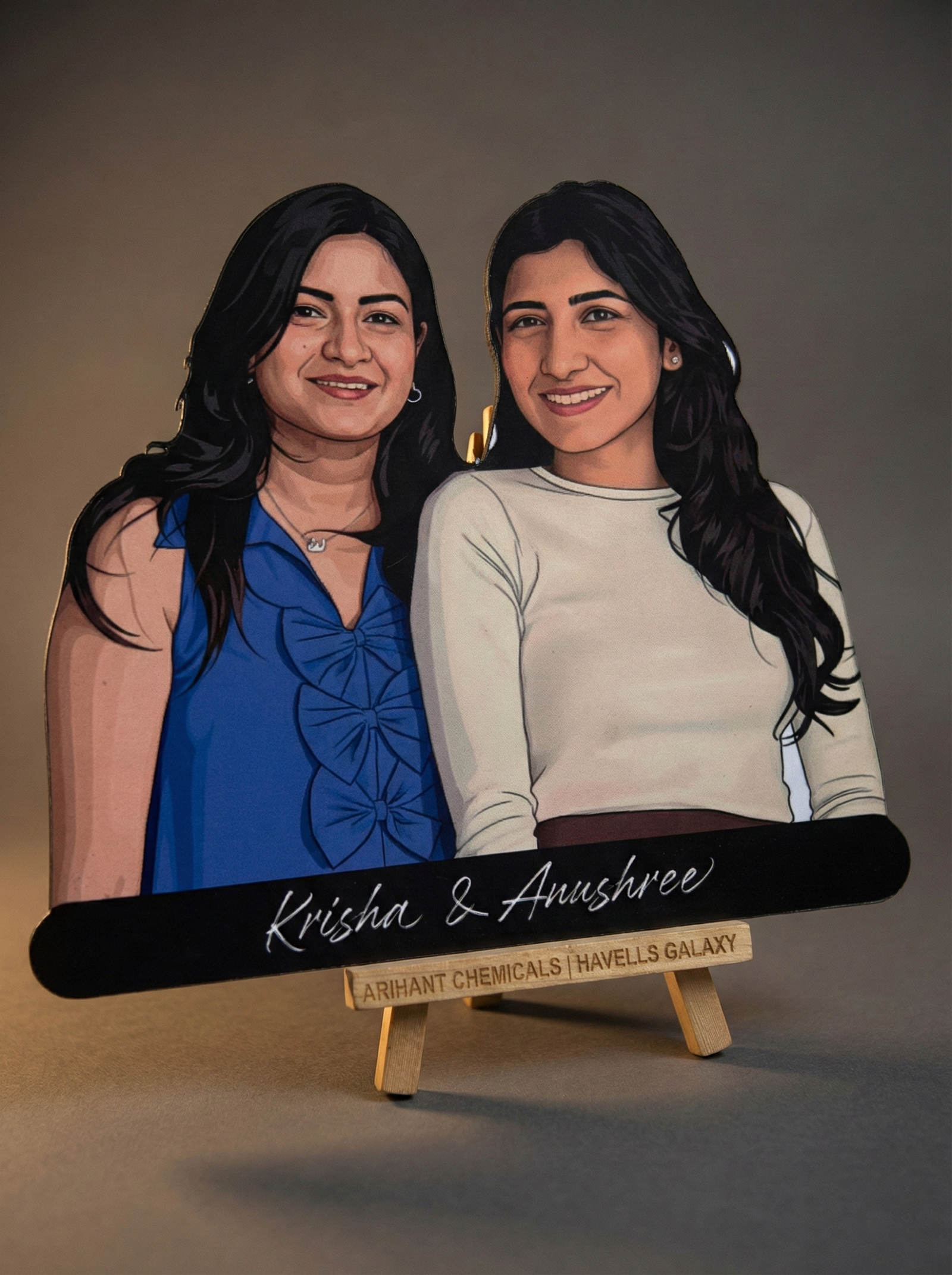 A Wooden Cutout is a ready-made physical product crafted on wood with High Quality print of your caricature, perfect for table décor, gifting, or display.