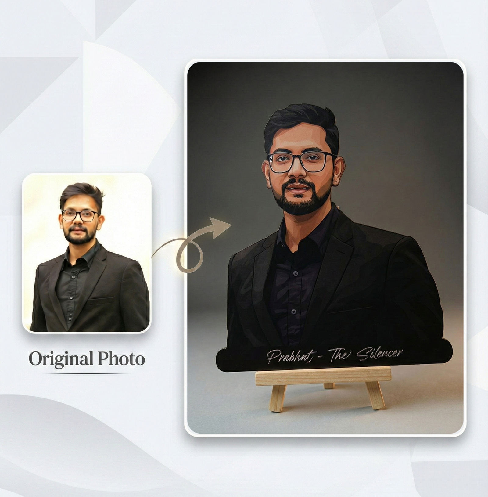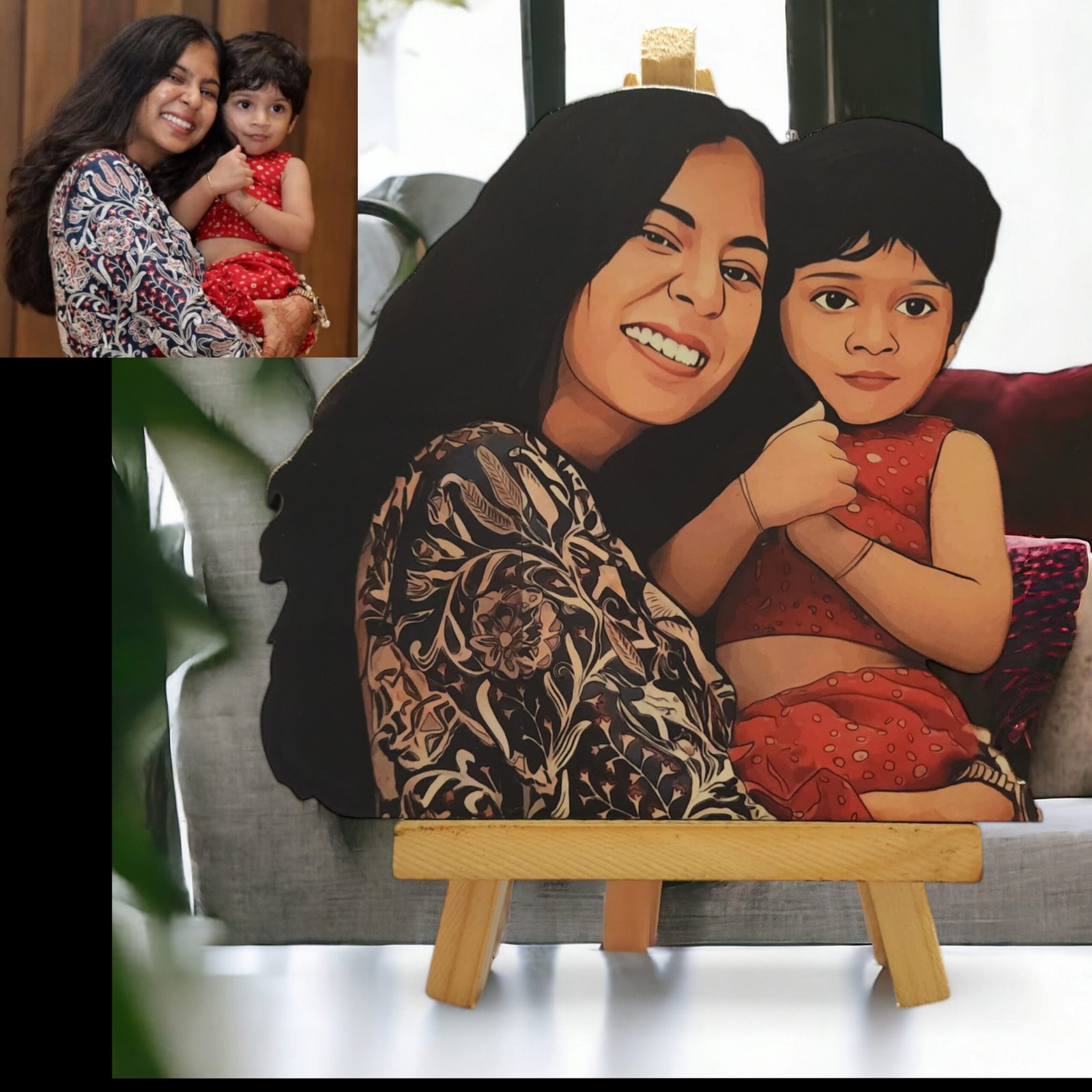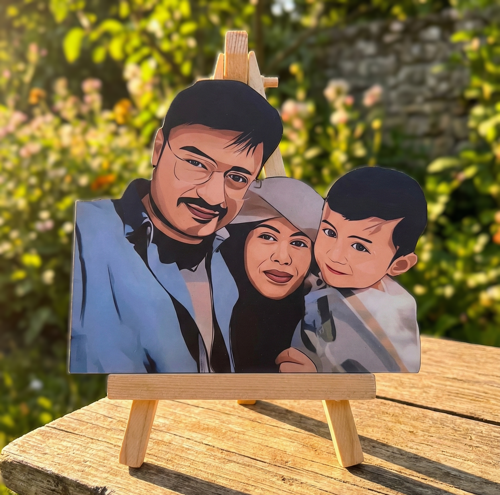 A Wooden Cutout is a ready-made physical product crafted on wood with High Quality print of your caricature, perfect for table décor, gifting, or display.