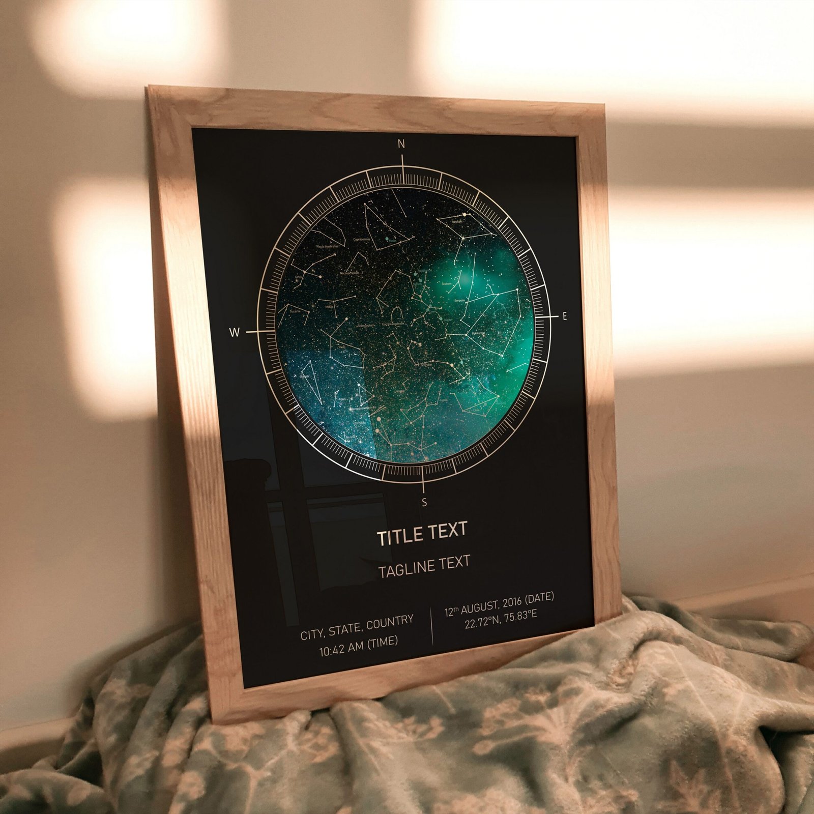 Once we’ve got your location, we need to calculate where objects appear in your sky. Our STARMAP is authenticated under the DE430 ephemeris, produced by NASA’s Jet Propulsion Laboratory (JPL) in California. NASA uses this to guide their space missions to their intended destinations, so it is astonishingly accurate. The star map shows the projection of the visible sky with the cardinal directions (North, South, East, West) indicated. We then beautify this map by adding graphics and plotting famous constellations to create a timeless piece of art ready to adorn your wall forever.